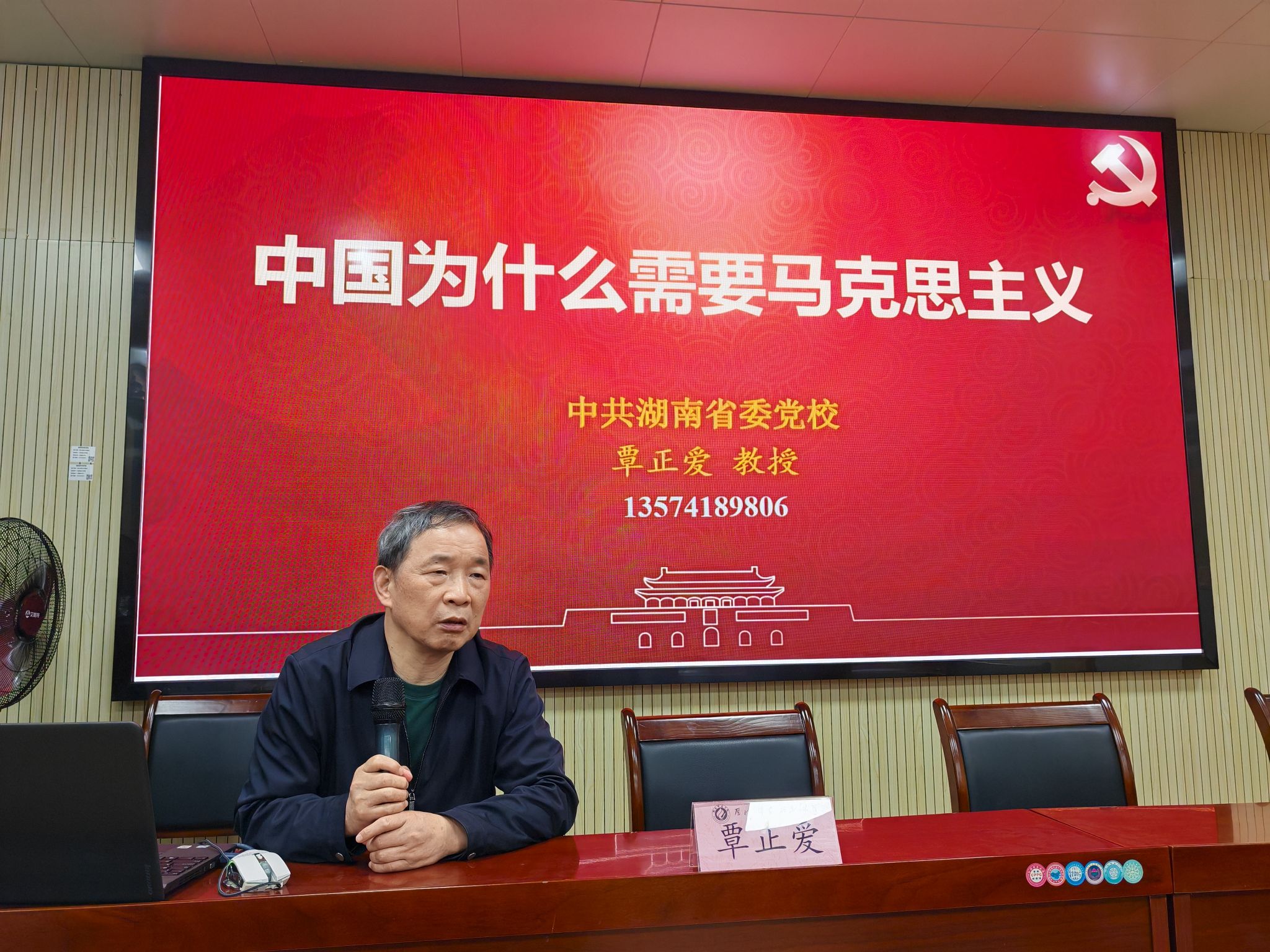 2025年9月26日下午3时,中共湖南省委党校覃正爱教授应邀莅临我院,在仁智楼D栋六楼会议室面向师生作了一场题为“中国为什么需要马克思主义”的专题讲座。本次讲座由马克思主义学院副院长谢芳教授主持,马克思主义理论专业全体研究生、马克思主义学院“初心”理论宣讲团成员及部分教师近80人参与聆听。覃教授以其深厚的学养和富有激情的讲述,令在场师生沉浸于思想的碰撞中,现场互动频繁、气氛热烈。
