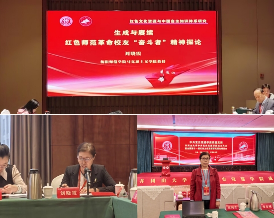 我院刘晓霞教授带领2024级硕士研究生李文、2025级硕士研究生郑颖以《生成与赓续:红色师范革命校友奋斗者精神探论》一文参会,同与会专家学者围绕红色文化资源研究、党史党建学科建设等核心议题展开深入研讨,刘晓霞教授应邀在平行论坛中作主题发言。她从一个思政老兵的视角和亲身经历出发,向来会专家们介绍了近年来衡阳师范学院广泛开展的红色校本文化挖掘与传播活动,引起了专家学者们对“红色师范”这一思政创新元素的浓厚兴趣。她提出“以革命校友事迹为切入点,构建红色校史与思政教育深度融合”的实践育人思路,引发论坛点评专家与参会学者的热烈讨论和一致认可。